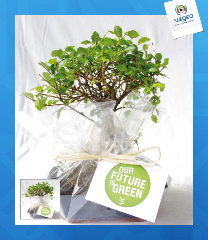 Le pot du bonsaï est enveloppé avec du papier fleuriste lié par un brin de raphia pour une présentation soignée et une conservation de l’humidité au niveau du pot.
