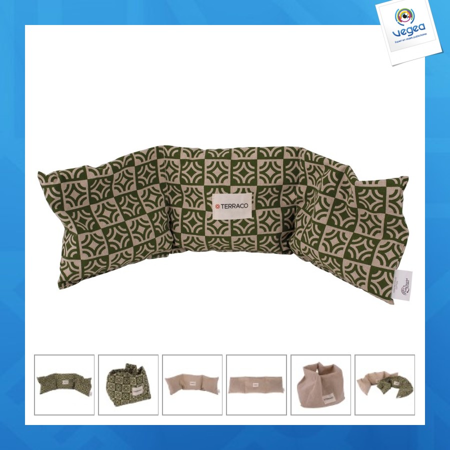 Bouillotte sèche avec noyaux de cerise en 3 compartiments, cela signifie que vous pouvez l'utiliser sur une plus grande partie de votre corps, comme votre cou. Ils peuvent être utilisés chauds ou froids, les deux options offrant des résultats thérapeutiques relaxants. L'exemple présenté sur les photos est en coton recyclé 150 gr. Certifié GRS. Possibilité d'imprimer 100 % du bouillotte en sérigraphie ou marquage digital. Étiquette en coton et teinture du coton au Pantone en option. Marquage et production dans notre usine au Portugal. Bande de papier kraft havane avec maquage 1 couleur (noir) 1 face (mode d'utilisation + logo de votre client) en option.