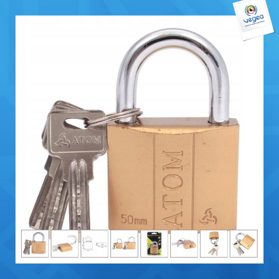 Cadenas en fonte Atom 40mm. Bandeau en acier chromé. Protection contre la corrosion. 3 clés en acier.