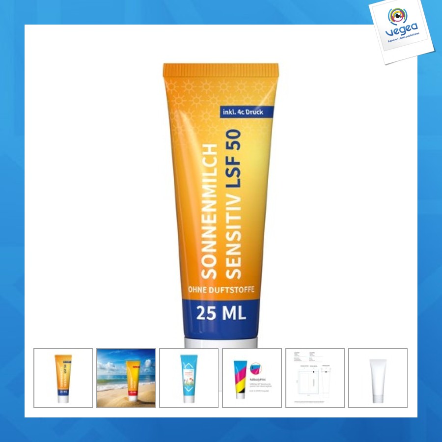 Lait solaire sensible - FPS 50, non parfumé et sans substances aromatiques (haut niveau de protection). Tube de 25ml (blanc), avec bouchon à vis (blanc), joint d'hygiène avec membrane inviolable. Écran solaire imperméable et à absorption rapide avec de la vitamine E et de la glycérine pour une hydratation à long terme de 24 heures. Protection immédiate avec filtre large bande UVA/UVB équilibré. Sans octocrylène. Végétalien. Pas de microplastiques. Pas de parabènes, huiles minérales, silicones. Coraux respectueux des coraux selon hawaii reef law. Testé cliniquement et dermatologiquement. Très bien toléré par la peau. Fabriqué en Allemagne Fullbody Print: Impression pleine surface à 360 ° sur tout le tube, y compris la couture scellée. L'impression se fait directement sur le tube dans une incroyable qualité photo 4c (CMYK). Il n'y a pas de frais d'impression supplémentaires par pièce: le prix comprend l'empreinte sur le tube. Testé dermatologiquement. Très bien toléré par la peau (étude clinique). Fabriqué en Allemagne. VOC g pro Stck : VOC-frei Durée de conservation minimale : 3 ans / 6 mois apres ouverture Délai de livraison standard : ca. 4-5 semaines