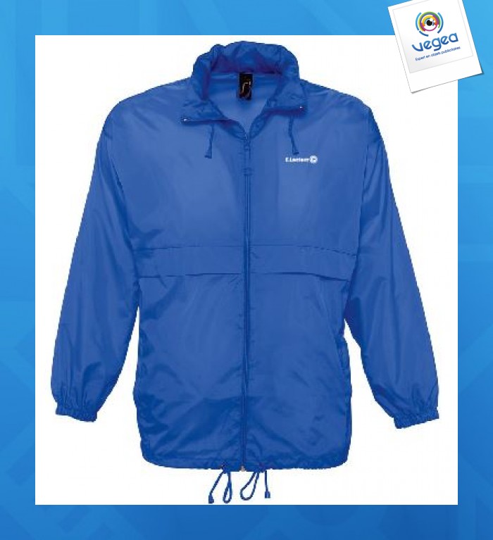 Coupe-vent non doublé100 % nylon 210 T, imperméable,col montant avec zip, capuche et cordon de serrage pliés dans le col, fermeture par zip sur le devant, 2 poches extérieures zippées, coupe-vent pouvant se plier dans la poche avec élastiques se nouant à la taille, poignets avec élastiques, 2 oeillets d'aération sous chaque manche, bas avec cordon et embouts, étiquette tissée