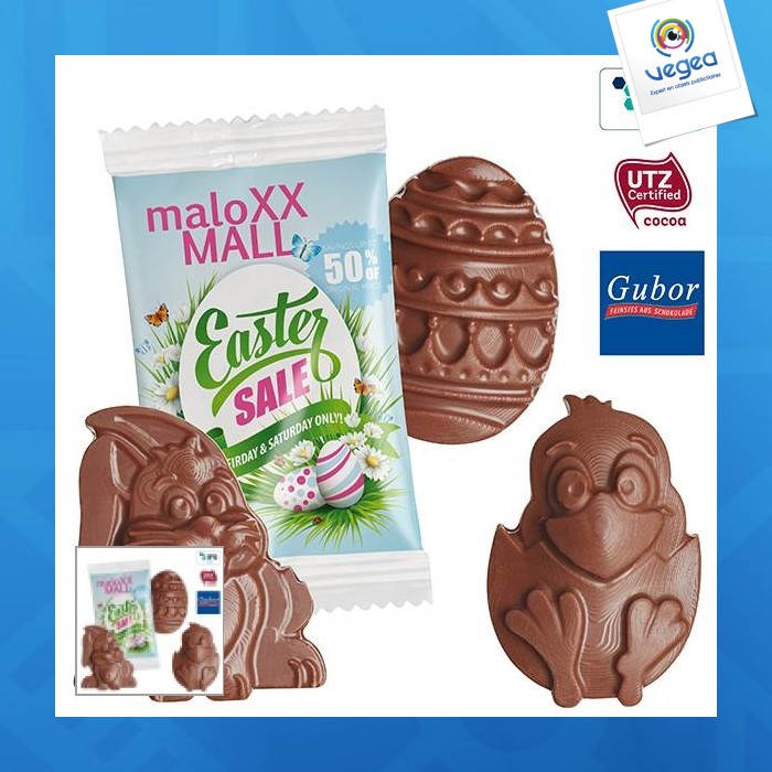 - Figurine en chocolat «Pâques» avec motifs festifs : Lapin de Pâques, Poussin de Pâques, Œuf de Pâques